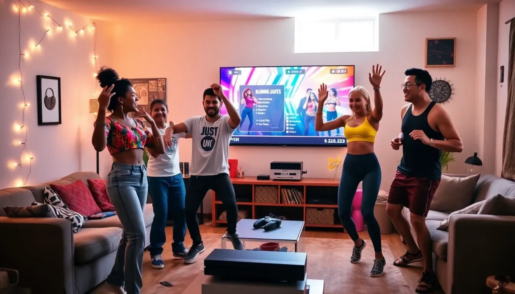 four friends dancing joyfully in a living room while playing Just Dance 2022.